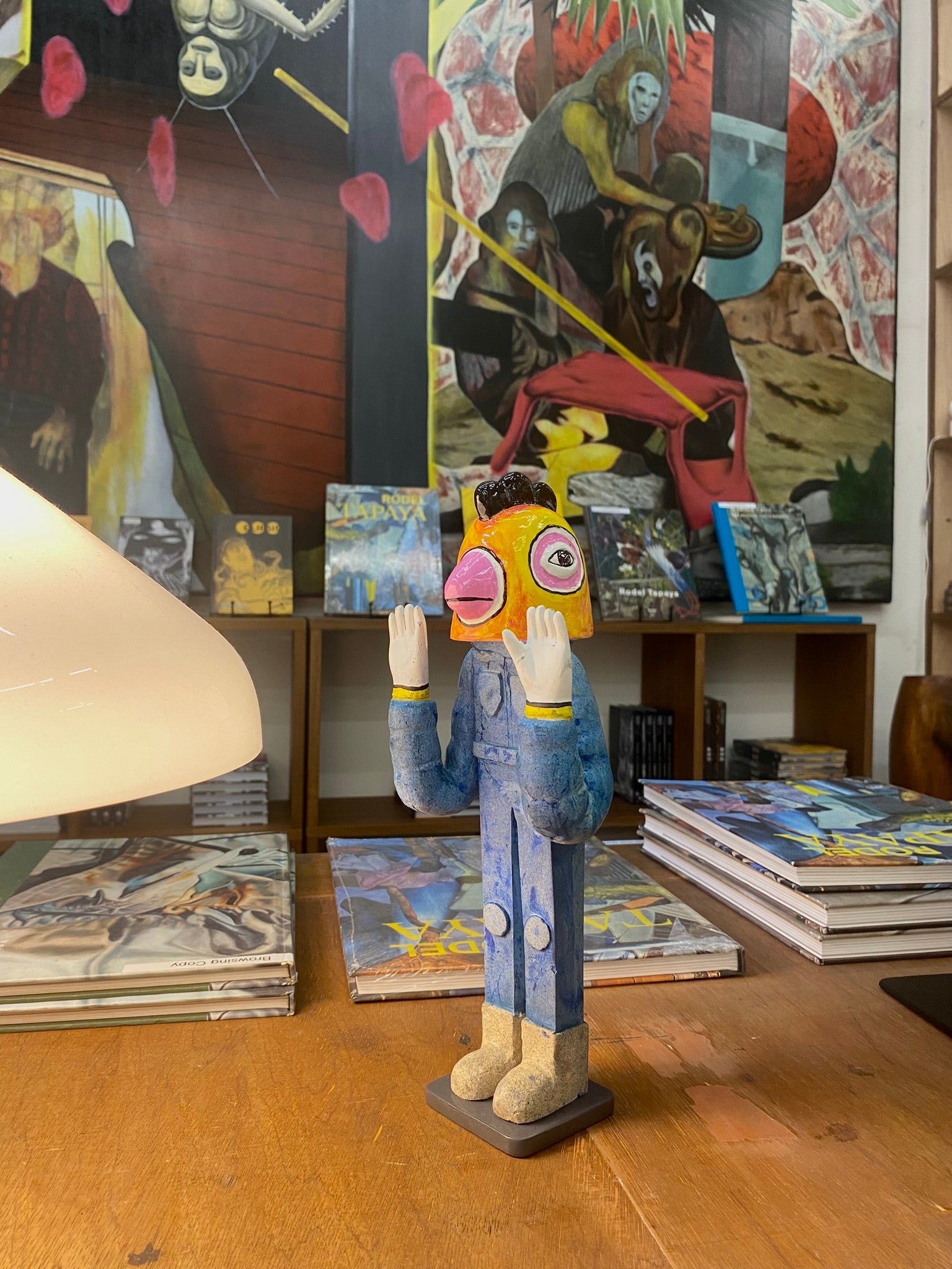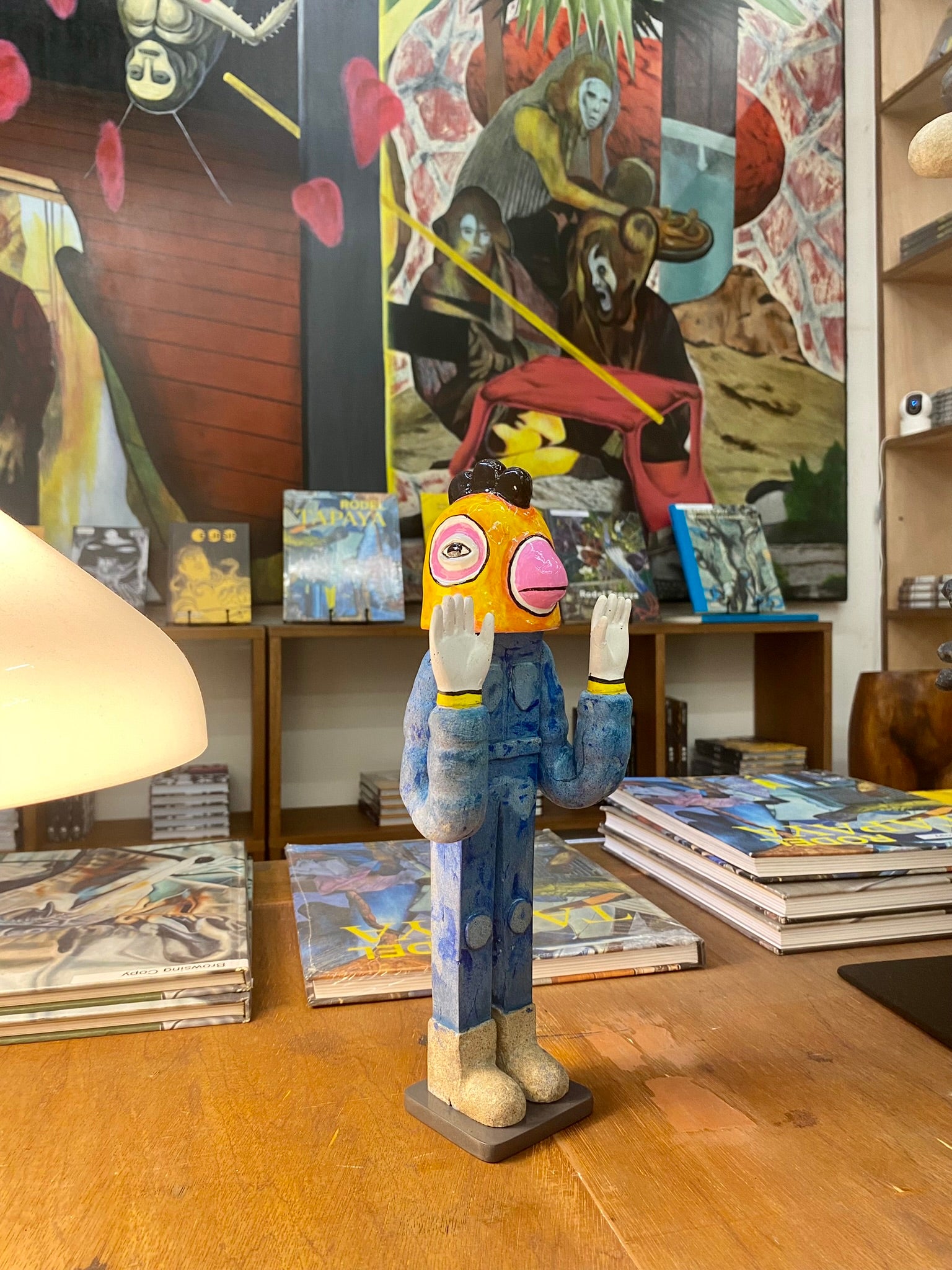 A myth that was said to hatch from Bulacan, "The Origin of Birds" serves as the inspiration for Rodel Tapaya's Chicken Army sculptures. This tale brings us back to a time long past, when birds still ceased to exist on Earth. There were instead three kings: Rajah Manuk, Rajah Uwak, and Rajah Lawin who fought amongst each other with the goal of expanding their respective dominions. With their blatant display of greed and brutality, the infuriated gods punished them by transforming them and their tribes into birds—a lasting reminder of their cruel acts to their progeny. Having been the greediest, Rajah Manuk and his tribe were particularly turned into terrestrial birds so that they may always remain grounded.